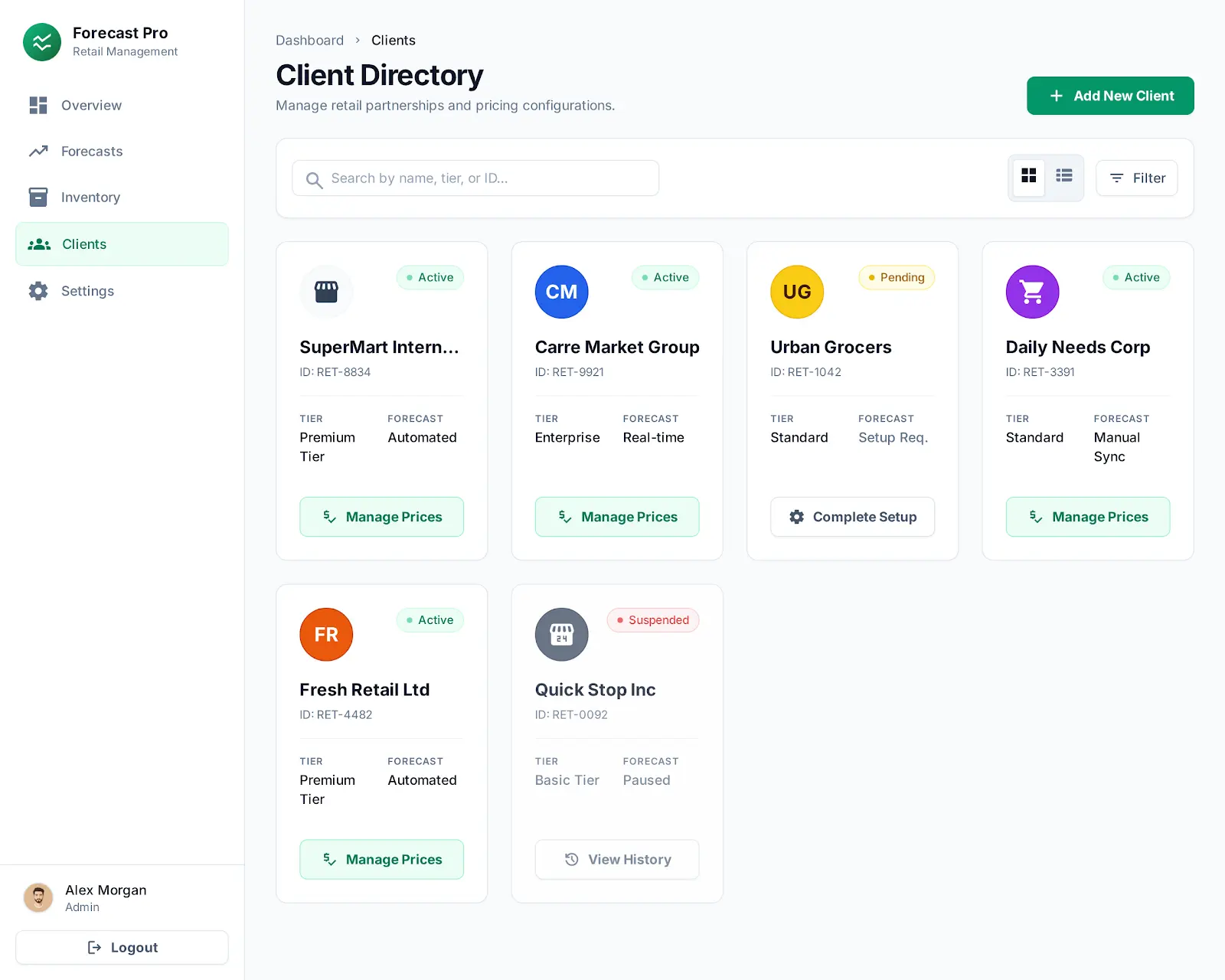 Création d'un portail web multi-tenant avec interface d'administration, système de gestion des prix négociés par client, module de soumission des prévisionnels avec validation automatique, et tableau de bord de suivi des disponibilités en temps réel par site.